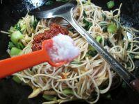 3.接着,合入已清洗好的绿豆芽,加适量的生抽。